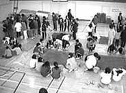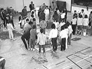 去る1999年12月21日 (火)と2000年1月18日 (火)の二日間にわたり現代画家ゴトウ・シュウ氏と相模原市立上溝小学校6年生全員(125名)による作品共同制作が行われました。これは市立上溝小学校(嶋田 寛徳校長)の企画・主催による特別授業として行われ、「ゴトウ・シュウの平面世界展」を開催中(1999年11月23日〜2000年1月30日)でありました光と緑の美術館は全面的にご協力をさせていただきました。
