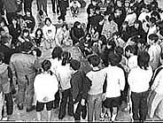 子供たちは12名を一組とし、2枚一組としたベニヤ板を受け持つ。整列終了後、嶋田
